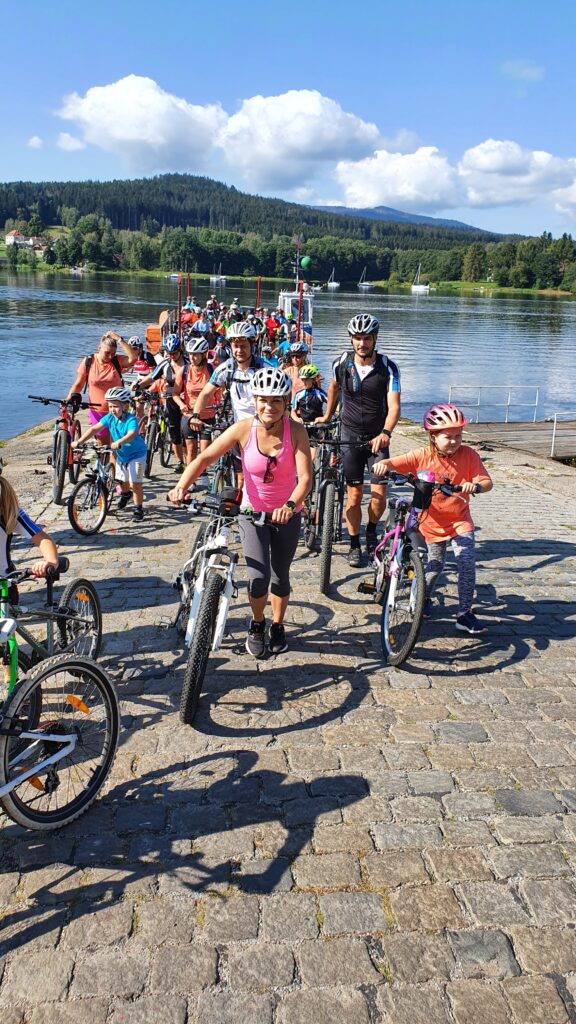 Sobota začínala rozcvičkou v 7:45. Dostavily se všechny děti, dospělí úplně všichni ne, já taky ne. Hledala jsem Ibuprofen. V 8:15 jsme měli snídani a v 9:15 jsme vyrazili na kola. Jedna velká parta. Ve stejných tričkách jsme se vydali do Bližší Lhoty, převozem do Horní Plané a pak zpět do Nové Pece. A musím říct, že to bylo úžasný. Kromě samotného ježdění, mě uchvátila nálada v tak velkém týmu. Úplně a přesně tady sedí „Všichni za jednoho, jeden za všechny“. Čekalo se na všechny, každý pomáhal každému, dospělí spolupracovali s dětmi, děti s dospělými. A to bez ohledu na to, koho je to dítě. O víkendu to byly NAŠE děti. Vyjížďka trvala celé dopoledne. A fakt to bylo na pohodu, až mi bylo líto, že se musíme vracet na oběd. To dopoledne uteklo moc rychle. Zpátky jsme se vraceli už po skupinkách. Díky Alešovi jsem zjistila, že umím jezdit i lesní cestou :). Naše skupinka dorazila jako druhá, ti co byli už u chatek, byli překvapení ze Šárinky a z Verunky jak to super zvládly a že dorazily mezi prvními.